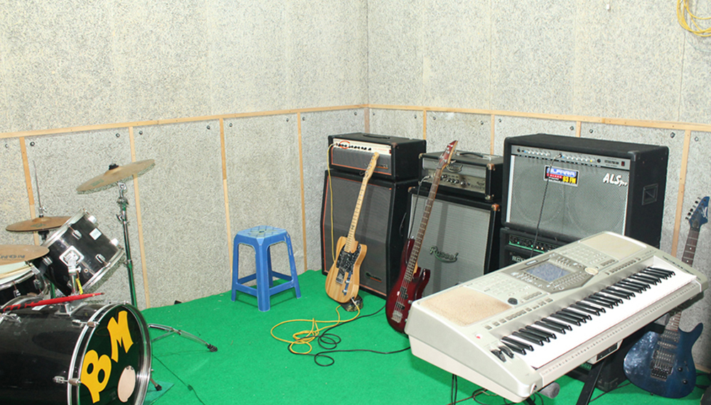 Studio band dengan fasilitas standar untuk berlatih dan rekaman.